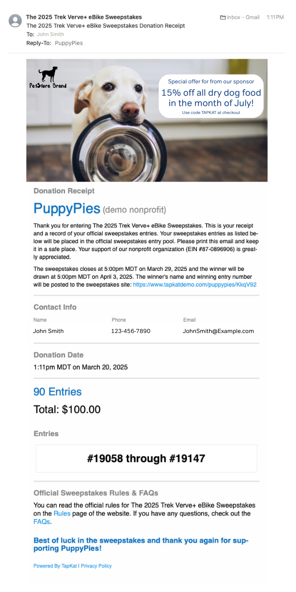 When you have a Sponsor Campaign running with your TapKat sweepstakes, the donor will enter by making a donation as usual. However, once they’ve completed their transaction, they will receive an offer from the sponsor on the web page after they make a donation, as well as in their emailed receipt. Your sponsor will provide the image, and you can easily upload it from your TapKat dashboard. It is linkable, and when the donor clicks through, they can take advantage of the offer quickly and easily.